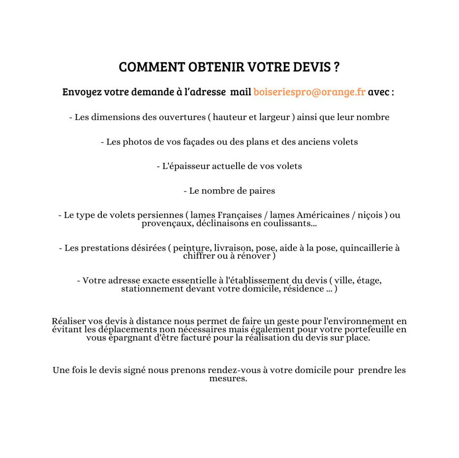 | Veuillez en premier lieu nous communiquer le type de volets choisi ( provençaux, coulissants, ou bien encore persiennes ) , la hauteur ainsi que la largeur des tableaux existants et non pas des menuiseries ( nous appliquons une tolérance de deux centimètres environ ), ainsi que l'épaisseur des volets existants directement par mail à l'adresse boiseriespro@orange.fr Nous sommes encore plus réactifs pour les demandes de devis fournies avec des photos de vos façades, n’hésitez pas à en joindre ! Vous ne savez peut être pas comment prendre les mesures de vos tableaux ? Pas de soucis nous avons un article qui répond à cette question dans notre catégorie FAQ. |