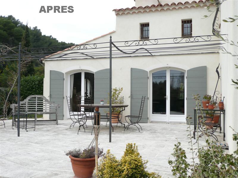 Visualisez nos réalisations de volets CTBX en essence de bois exotique Okoumé fabriqués et posés par nos soins à Cassis près des Calanques.
