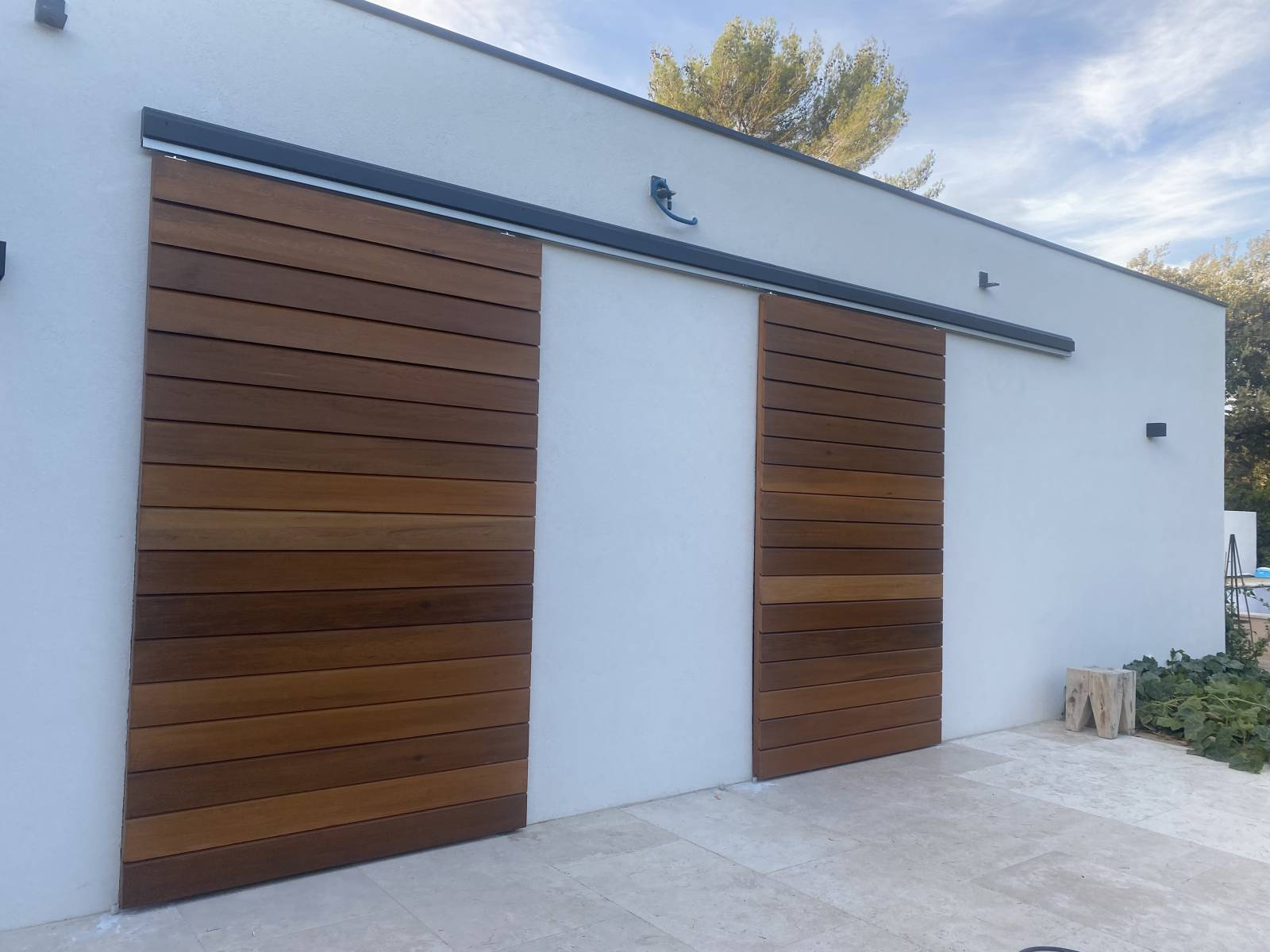 Voici l'une de nos réalisations de volets coulissants en bois sur mesure pour une villa sur Allauch (13).